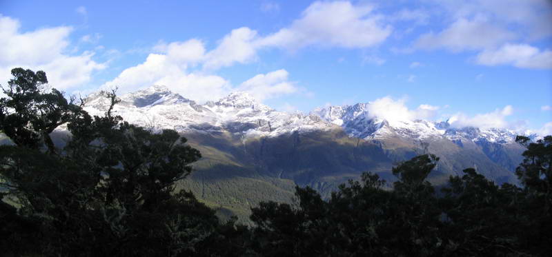 We completed the trek February 14-16, late summer. This was Alice's first time overnight backbacking in New Zealand, and indeed anywhere in about 30 years! The DOC brochure advises that Routeburners should expect rain on one day out of three -- and that's what we got. Day 1 was brilliant, with easy hiking up the Route Burn (stream) to the Routeburn Falls Hut. It rained and blew steadily on Day 2, the longest segment with an alpine crossing to MacKenzie Hut. Day 3 was chilly but sunny with fine views of the freshly snow covered Darran peaks. The grand views promised from Harris Saddle at the mid-point of the trek were lost in the mist, but there were plenty of vistas on the other two days. Fortunately, when we saw the rainy forecast posted at the Falls Hut, we beetled most of the way up to the saddle and back on the first afternoon, thereby passing through the spectacular alpine basin at the headwaters of the Route Burn in sun one day and rain the next. Besides the views, we were greatly impressed with the raw glaciated geology and the splendid examples of New Zealand plant communities, both in the beech forest zones and the alpine "tops." The fresh rain made the numerous rushing streams and waterfalls particularly dramatic.
